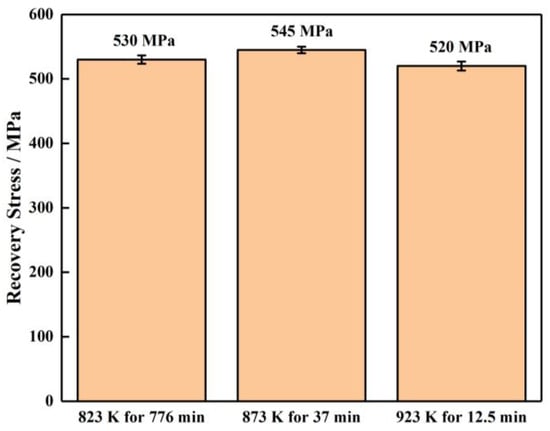 Figure 11 shows the recovery stress of the TiNiFe alloy with different heat treatments calculated by the Avrami model and Arrhenius equation. It can be found that the recovery stresses of all the heat treatments as calculated by the Avrami model and Arrhenius equation have similar values. However, as shown in Figure 11, the TiNiFe alloy shows the highest recovery stress after annealing at 873 K for 37 min, and the lowest at 923 K for 12.5 min. This is also related to the grain size shown in Figure 8 above, which indicated that a finer average grain size will result in higher recovery stress in TiNiFe alloys. Therefore, it can be verified that the alloys have similar shape−memory effects under the calculated heat−treatment processes.