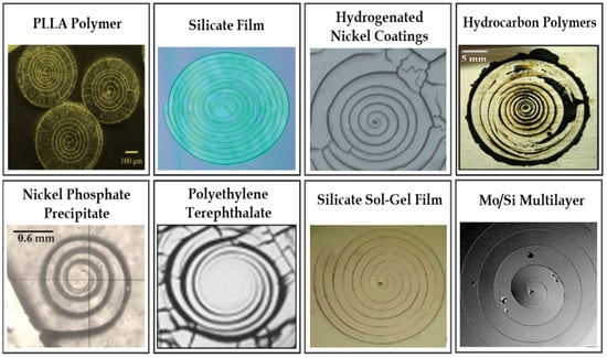 7]. In another study, Meyer et al. investigated spiral cracking patterns in the Mo/Si multilayers (60 layers) with the thickness in the range of a nanometer deposited on Si substrates. Spiral cracks were observed in the material during uniaxial bending at high temperatures between 300 and 440 °C in a vacuum. The formation of spiral cracks, which was accompanied by Mo/Si multilayer debonding from the substrate, was linked to the combination of thermal, bending, and residual stresses [