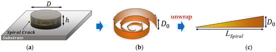 Figure 2 schematically illustrates the mechanism of spiral crack development. The deformation mismatch between the coating layer and the substrate induces biaxial tensile stresses within the coating/substrate system, which will act as the driving force behind the crack propagation in the material. As the magnitude of the induced stresses increases, first a network of channeling cracks (i.e., mud cracks) appears hierarchically, dividing the layer into several polygonal sections. After the formation of mud cracks, the partial detachment of the material from the substrate (partial delamination) takes place within the polygonal sections. A delamination front begins from the edge of the polygonal cell and grows toward the center of the cell. While partial delamination occurs, the spiral crack starts at the border of the adhering region of the fragmentation from some initial imperfection or a weak interface and propagates along a spiral trajectory.