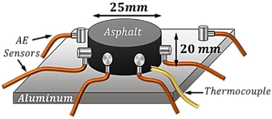 AE sensors with a relatively flat response over the target frequency range capable of working properly in the target range of the test temperatures were utilized. For the asphalt materials, broadband AE sensors with flat responses in the frequency ranging 20 kHZ–1 MHz were used. To minimize the extraneous noise (i.e., separating genuine fracture-originated AE signals from noise), the signals were pre-amplified to 20 dB using broadband pre-amplifiers. The signals were then further amplified by 21 dB (for a total of 41 dB) and filtered using low-pass (LPF) and high-pass (HPF) filters of 500 kHz and 20 kHz, respectively, with the Fracture Wave Detector (FWD) signal condition unit. The signals were digitized using a 16-bit analog-to-digital converter and a sampling frequency of 1 MHz and a length of 2048 points per channel per acquisition trigger. At the postprocessing stage, all the AE signals with energy lower than 4 V2-μs were filtered out. Moreover, the standard pencil-lead break (PLB) test was performed routinely before conducting the experiments in order to calibrate the AE system as well as the AE sensors and to make sure the variation within the AE channels was negligible.