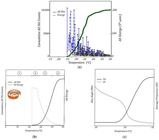 AF) (this type of signal is usually observed in fracture Mode I), while the signals recorded at lower temperatures exhibited a longer duration time, longer rise times, a low amplitude, and a lower frequency (high