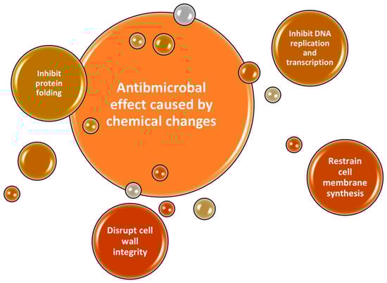 Like Ag, the Cu ions from nanoparticles can interact with the DNA and proteins, disrupting the cellular biochemical structure and process. A study [63] proposed the obtaining of cement mortars for the treatment of waste water and for the inhibition of bacterial growth. They obtained Cu-Ti alloys in atomic ratios: 35:65, 50:50 and 65:35 by ball grinding. The authors of this study investigated the influence of different concentrations of amorphous Cu-Ti alloy (from 0.3 to 0.9 wt.%) added to mortars, together with 0.5% superplasticizer. The Cu-Ti alloy (35:65) has the finest particles, leading to an increase in the mechanical properties of the mortar. The mortar with 0.9 wt.% Cu-Ti alloy (50:50) recorded the best antibacterial effect. Another study [64] showed that cell filamentation is caused by membrane depolarization, under the influence of Cu nanoparticles, more precisely under the influence of Cu2+ ions, resulting from the oxidation of the metallic Cu atoms of the nanoparticles. The destruction of cells is caused by the production of ROS under the action of nanoparticles, leading to DNA degradation, together with lipid peroxidation and protein oxidation. Table 2, there are shortly summarizes the most popular theories about the antimicrobial effects of selected nanoparticles.