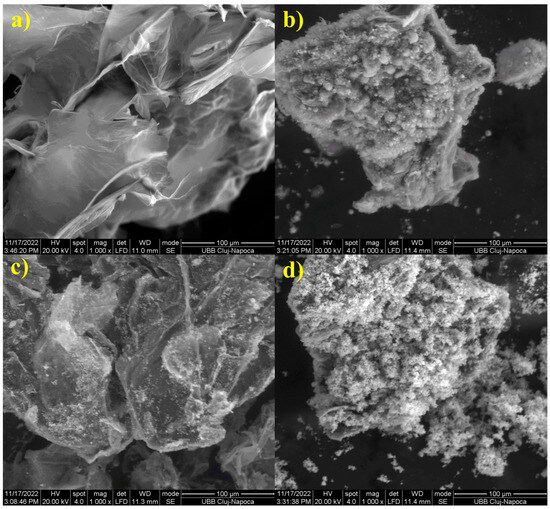 SEM images of the GO: (a) GO; (b) GO with fly ash; (c) GO with silver; (d) GO with ZnO at ×1000 magnifications.