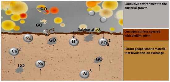 The addition of Ag, Cu, TiO2, ZnO, or GO nanoparticles in the geopolymer matrix can lead to an increase in resistance to compression, dehumidification, and a potential antibacterial effect. Bacteria develop on the surface of any material if they have favorable conditions such as a suitable temperature, a source of nutrients that can be absorbed and decomposed by enzymes to provide the energy necessary for bacterial growth, a suitable pH, and a gaseous environment. At a pH value between 12 and 13, bacteria will not grow on the surface of the freshly prepared material. However, there are environments, such as sewage, where, after a while, an increased concentration of H2S accumulates. In the case of sewer pipes, it was found that sulfate ions deposited on the material in an anaerobic environment. These are reduced by sulfate-reducing bacteria, leading to the formation of H2S. In contact with the pipe walls, H2S is oxidized to H2SO4 by sulfur-oxidizing bacteria in the air. Figure 3 presents a case of a porous geopolymer, with graphene oxide as an additive used for sewage, which, in a closed environment, suffered an acid attack. Especially in the case of sewers where there is water and the bacteria have a large amount of nutrients, concrete corrosion is more serious. The nutrients of sulfur-oxidizing bacteria are provided by heterotrophic fungi that break down organic substances with sulfur even in a large pH range. Through the action of microorganisms, other acids can be produced, such as HNO3, acetic acid, or oxalic acid, which can also lead to concrete corrosion. When the pH inside drops below 9, microorganisms multiply. These microorganisms will provide acid, and the pH can drop even more [49]. Around a pH of 4, there is a massive bacterial proliferation, leading to the worsening of concrete corrosion. The advantage of geopolymer concrete compared to plain concrete is that the microorganisms have a larger volume than the pore size, the material being more compact, and the acid metabolism takes place only on the surface of the material, making the corrosion process more difficult [50]. Data from the literature report that physical contact can cause the destruction of bacteria, through the ion exchange mechanism. The divalent cations in the outer wall of the cell membrane can be dislocated by the cations on the surface of the material loaded with antimicrobial additives, leading to cell death. The authors are of the opinion that the sharp tips that come out of the surface of a material (for example, graphene oxide has sharp edges) can pierce the cell wall, causing the leakage of the cytoplasm and finally cell death [51]. The mechanism of inducing the antibacterial effect depends on the type, shape, and size of the added nanoparticles and is explained below.