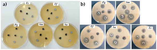 Disk diffusion assay on Porphyromonas gingivalis (Pg), Streptococcus mutans (Sm), Staphylococcus aureus (Sa) and Escherichia coli (Ec) for the GO powders [21].