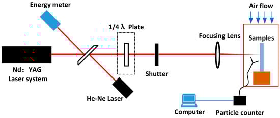 Laser damage experiments were conducted using an Nd:YAG laser. A Gaussian laser beam of 5 ns (1/e2) at wavelengths of 355 and 1064 nm was irradiated onto the surface of the aluminum alloy sample, and the spatial beam had a Gaussian distribution with a spot size of 1 mm2. The aluminum alloy sample to be tested was placed inside a small laminar flow hood, and a laser particle counter probe was placed under the hood, as shown in Figure 1. The velocity of clean air at the top of the laminar flow hood is approximately 0.5 m/s, and the static cleanliness class is better than ISO class 1, ensuring that the particle contaminants generated by the aluminum alloy under laser irradiation can be tested by the laser particle counter in its entirety, and no new contamination is introduced.