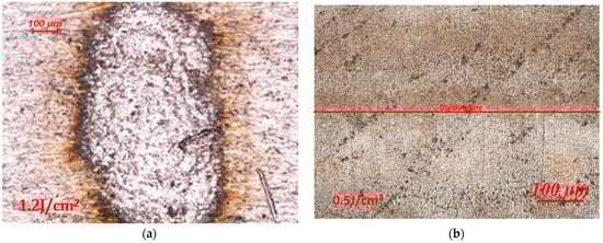 Optical micrographs of aluminum alloy under laser irradiation: (a) high-energy laser-irradiated area and (b) low-energy laser-irradiated area.