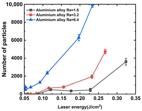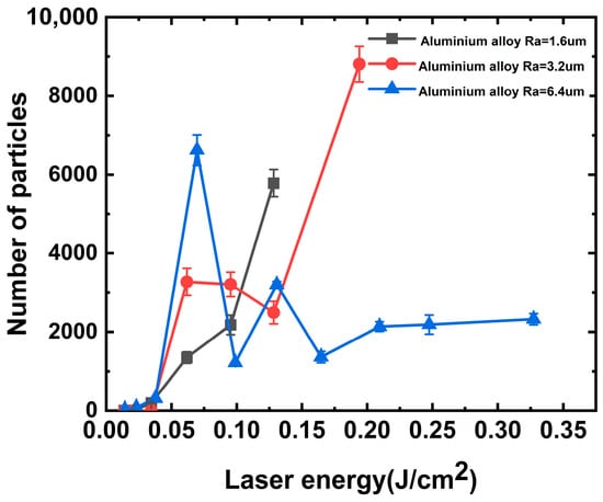 To better understand the mechanism of particle generation via laser association with aluminum alloys, aluminum alloys with different roughness values (Ra of 1.6, 3.2, and 6.4) were irradiated with a laser at wavelengths of 1064 and 351 nm, and the number of particles generated (0.5 um particles for example [29]) were completely counted using a laser particle counter, and the results are shown in Figure 3 and Figure 4. It can be observed from the figures that the laser threshold of particles generated from the aluminum alloy under the action of the 1064 nm laser decreases with the improvement in roughness. Under a roughness of 1.6 μm, the initial particle generation threshold of the aluminum alloy is approximately 0.121 J/cm2 and generates 491 particles, as shown in Figure 3. However, under a roughness of 3.2 μm, the laser energy of the initial particle generation of the aluminum alloy is approximately 0.116 J/cm2 and generates 673 particles. We argue that the variation in the particle number due to the roughness is approximately 37% under the same laser energy irradiation. However, the initial laser energy for particle generation of the aluminum alloy at 6.4 μm roughness is approximately 0.054 J/cm2, and a significant quantity of particles can be generated at this energy. A single laser irradiation can generate 755 particles, and the threshold value for particle generation is approximately 0.05 J/cm2. Furthermore, the number of particles and laser energy exhibited an exponential growth relationship. In addition, we similarly observed that when the roughness is below 3.2 μm and the laser energy is lower than 0.225 J/cm2, a phenomenon occurred where particles produced using aluminum alloy and the irradiation laser energy increase first and then decrease, which is associated with the mechanism of the laser cleaning threshold of particles.