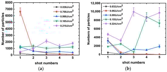 Number of particles produced by single-shot laser irradiation of aluminum alloy at 351 nm: (a) Ra = 6.4 and (b) Ra = 3.2.