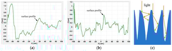 The two-dimensional morphology of aluminum alloy surfaces before and after laser irradiation is shown in Figure 8a,b. The difference between the highest and lowest points on the surface is about 2.2 μm before the laser irradiation, but it is about 1.6 μm under the laser irradiation. And also, one can find many spike-like structures, which is the same in Figure 7b. Embedded particles formed between spikes during processing were completely removed under laser irradiation, resulting in the exposure of the spike structure. Some of the spikes were also ablated and removed under laser irradiation, forming a trapped light structure, as Figure 8c shows.