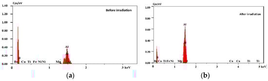 EDS spectra of the aluminum alloy surfaces: (a) initial and (b) after laser irradiation.