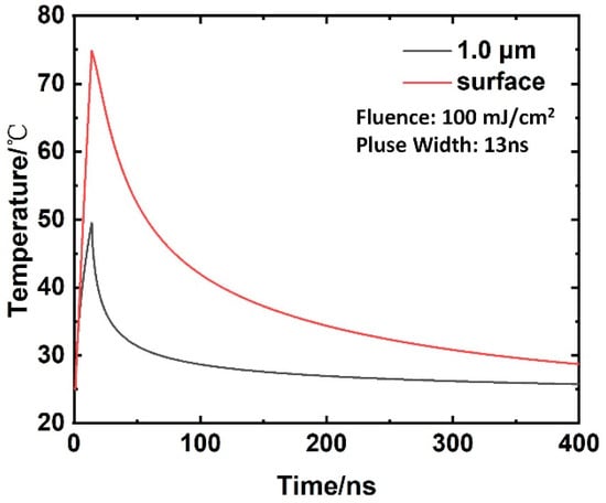According to the parameters of Equation (5), Table 1 and Table 3, the temperature field distribution of the aluminum alloy surface under laser irradiation can be calculated and obtained, as shown in Figure 10. From Figure 10, it can be observed that the temperature reaches the apex at the same time as the pulse width, and the highest point temperature of the surface is approximately 75 °C. When the depth is 1 um below the surface, the maximum temperature is about 50 °C. The surface temperature of the aluminum alloy returned to room temperature within approximately 300 ns of laser irradiation, and the recovery time was much shorter than the subsequent pulse irradiation time interval.