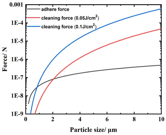 Cleaning force induced by laser irradiation and the adsorption force for different particle diameters.