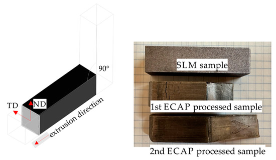 The ECAP experiment was performed using the LabTest 5.2000CT hydraulic press. The internal dimensions of the ECAP die were 14.25 × 14.25 × 60 mm. Therefore, the specimens for the ECAP experiment were cut to 14.20 × 14.20 × 50 mm and pressed once through a 90° die, which introduced an equivalent strain of ε ≈ 1, as shown in Figure 2. In order to reduce friction and the ECAP channel, the sample surface was covered with a thin layer of high-temperature grease.
