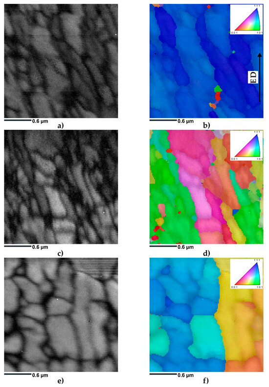 Figure 7b,d,f show the IPF-Y TKD maps superimposed on the BC maps. The IPF-Y maps revealed parallel bands of elongated subgrains, which were aligned nearly parallel to the extrusion direction (ED). Remarkably, the sample deformed at 100 °C showed only minimal orientation differences, with most of the grains exhibiting the <111> crystallographic orientation (Figure 7b). The IPF-Y TKD map of the sample deformed at 130 °C showed a greater variety of crystallographic orientations in the studied region (Figure 7d). Predominantly blue and green colors were observed, which was consistent with the <101> and <001> orientations. Figure 7f shows the IPF-Y TKD map of the sample deformed at 200 °C, which revealed a shift towards a more equiaxed grain morphology. In addition, the predominant blue and green colors were consistent with the <101> and <001> orientations.