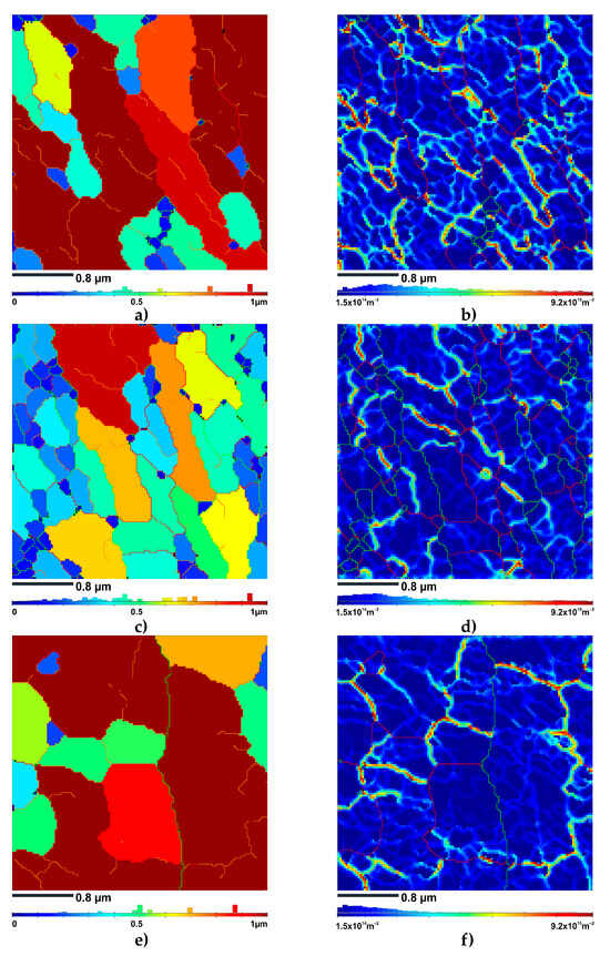 The unique grain color maps obtained from the TKD experiments provided a comprehensive visualization of grain sizes within the ECAP-processed samples (Figure 8a,c,e). The maps were created based on the criterion that the minimum disorientation between adjacent points (grain tolerance angle (GTA)) was set at 2 degrees.