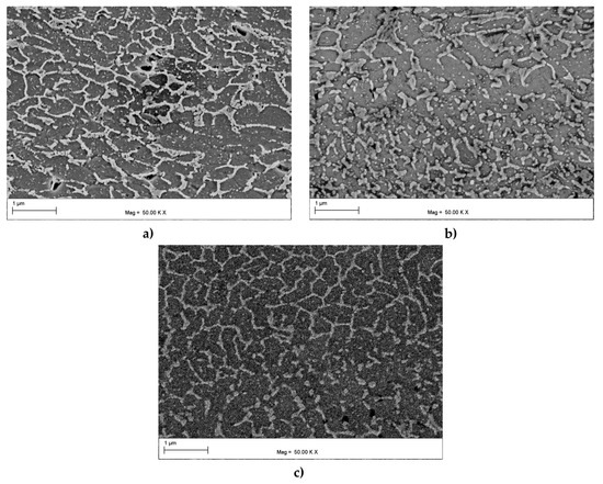 SEM microstructures of the AlSi10Mg alloy after ECAP processing: (a) HT320E100; (b) HT320E130; (c) HT280E200.