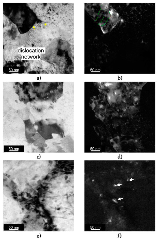 TEM characterization results: (a) BF TEM image of HT320E100 sample; (b) DF TEM image of HT320E100 sample; (c) BF TEM image of HT320E130 sample; (d) DF TEM image of HT320E130 sample; (e) BF TEM image of HT280E200 sample; (f) DF TEM image of HT280E200 sample.