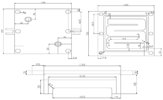 The 6061 aluminum alloy was placed in a high-purity graphite crucible and melted in a medium-frequency electromagnetic induction vacuum melting furnace. It was heated to 750 °C, and Al-6 wt.%Zr, Al-9 wt.%Mn, and Al-20 wt.%Si intermediate alloys were added sequentially. The mixture was stirred with a graphite rod for 1 min, left to cool until the furnace temperature reached 720 °C, and held at that temperature for 10 min. Hexachloroethane was then added and gently stirred with a graphite rod for 1–2 min. The temperature was raised to 780 °C and maintained for 10 min. After slag removal, the ingot was obtained by casting it into both iron and water-cooled copper molds, respectively. The structure diagram of independently designed water-cooled copper mold castings is shown in Figure 1 (note: the unit is millimeter).