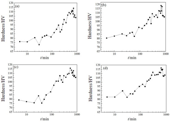 After the homogenization of the four alloys, the aging process was carried out in a QH2002A constant-temperature drying oven. The potentiometer was calibrated to maintain the furnace temperature within ±1 °C. The aging process was conducted at 175 °C. Vickers hardness was measured by cooling in water to room temperature. The hardness tests were performed using a 450SVD Vickers hardness tester with a 5 kg load and a load retention time of approximately 10 s. For each hardness test, the test value represents an average of 6 measurements.