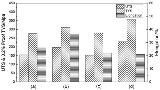 Tensile properties of aged 6061 alloys and 6061-0.15Mn-0.05Zr alloys: (a) 6061(Fe), (b) 6061(Cu), (c) 6061-0.15Mn-0.05Zr(Fe), and (d) 6061-0.15Mn-0.05Zr(Cu).