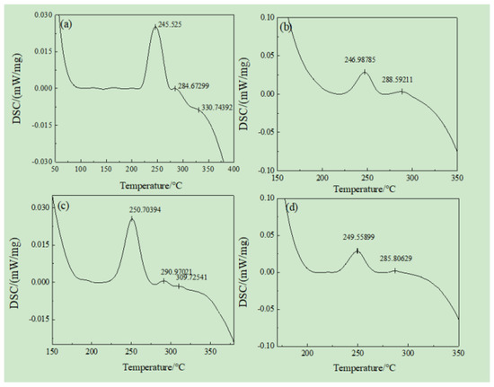 The literature [11] points out that, in the case of the Al-Mg-Si-Cu-Mn alloy, there exist a certain number and size of G.P.-region supersaturated solid solutions in the T4 alloy state. Therefore, when DSC is applied, a series of changes will occur in the microstructure of this state. Studies in the literature [46,47,48,49] indicate that the DSC curve of the Al-Mg-Si alloy in the T4 typically consists of four exothermic peaks: