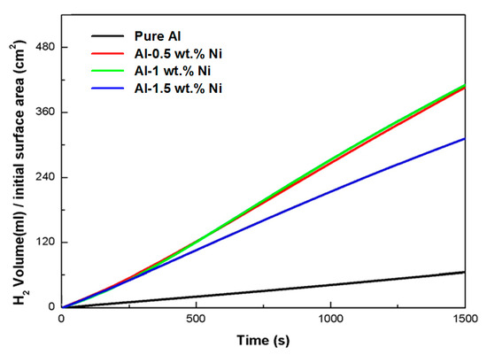 Effects of Ni content on the hydrolysis reaction of pure Al (black), Al-0.5Ni (red), Al-1Ni (green), and Al-1.5Ni (blue) in 10 wt.% NaOH solution at 30 °C.