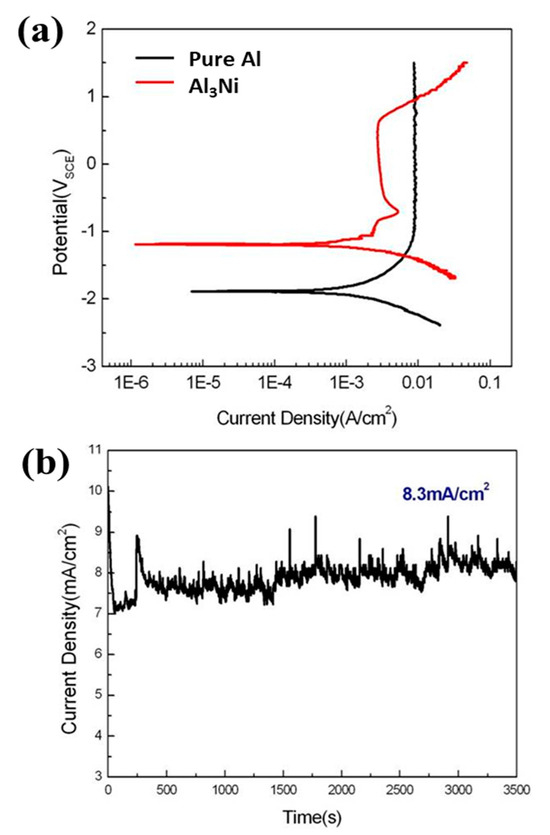 (a) Polarization behaviors of pure Al and Al3Ni, (b) galvanic current density of Al electrically coupled to Al3Ni in 0.1 M NaOH solution at 30 °C.