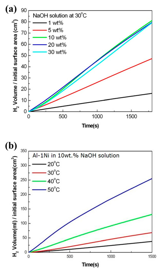 (a) Effects of NaOH concentration on the hydrolysis of Al-1Ni; 1 wt.% (black), 5 wt.% (red), 10 wt.% (green), 20 wt.% (blue), and 30 wt.% (light blue) at 30 °C. (b) Effects of solution temperature on the hydrolysis of Al-1Ni alloy in 10 wt.% NaOH solution with the temperature at 20 °C (black), 30 °C (red), 40 °C (green), and 50 °C (blue).