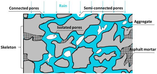 - As a porous medium, the pore structure of a porous asphalt mixture can be divided into three types according to the type of connection between the pores and the external space, namely connected pores, semi-connected pores, and isolated pores [26]. For porous asphalt mixtures with drainage properties, the disconnected pores can be considered part of the solid matrix. As a matter of fact, isolated pores and semi-connected pores are ineffective at allowing fluid to pass through porous media.