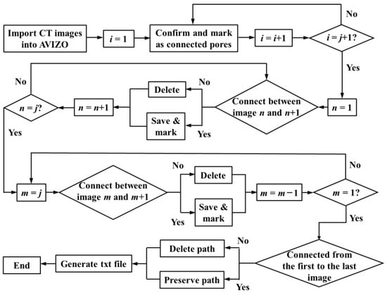 Pore connectivity is an important material property of PA mixtures, which is the channel and prerequisite for generating seepage [32]. Due to the randomness and anisotropy of the spatial distribution of the PA mixture pore structure, when analyzing the vertical (z-axis) connected pores, it is required to track all connected pores from the top surface to the bottom of the specimen and eliminate all disconnected pores. As shown in Figure 2, connected pores are identified through the FORTRAN algorithm [33,34], where i, j, m, and n are all image numbers.