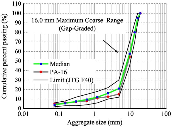 The test method refers to China’s Standard Test Methods of Bitumen and Bituminous Mixtures for Highway Engineering (JTG E20-2011) [36] and the Technical Specification for Permeable Asphalt Pavement (CJJ/T 190-2012) [37]. The specimens are prepared by a Superpave gyratory compactor (SGC), and its size (φ × h) is 100 mm × 100 mm. The coarse aggregate employed in this paper is limestone, and the fine aggregate and filler are granite. The gradation of the PA-16 mixture is designed based on the design steps of an OGFC [36]. The aggregate gradation of the asphalt mixture is illustrated in Figure 3, and the basic physical parameters of the specimen are shown in Table 1.