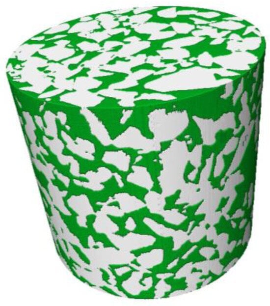 The three-dimensional visualization numerical model of the PA-16 specimen based on the Volume Rendering function of Avizo is shown in Figure 7. The gray part in the figure represents the solid porous matrix (aggregates and asphalt mortar), while the green part represents the pores.