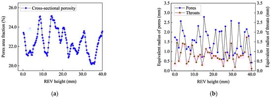 It can be seen from Figure 9a that along the REV height direction, the porosity of each section is mainly distributed between 20% and 25%, and the distribution is uneven along the REV height direction. This result is consistent with the existing literature [42] on the distribution of internal cross-sectional porosity in SGC specimens. In addition, as shown in Figure 9b, the equivalent radius of pores is mainly distributed between 0.5 mm and 3.0 mm, accounting for approximately 89.4% of the total pores ER. The pore throat, as the smallest cross-sectional area in the seepage path, the ER of throats is mainly between 0.1 mm and 1.5 mm, accounting for more than 79.5% of the ER of all throats, and the ER of the throat is about half of the ER of the pore.