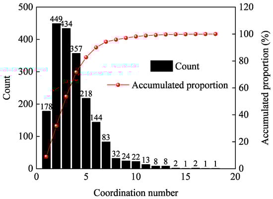 In Table 4, we can find that the maximum value of the coordination number in the PNM is 18, which means that the coordination number in the REV-3 is mainly concentrated within 18. Therefore, this paper only counts coordination numbers within 18 when studying the distribution of coordination numbers. As shown in Figure 12, pores with coordination numbers of 1 to 10 constitute the main body of PA mixture pores, accounting for more than 98% of the total pores. The distribution of pore coordination numbers exceeding 10 is in the form of discrete points, and the number is mostly single digits. For drainage asphalt pavement, the greater the coordination number, the more channels for conducting pore flow formed after the pore is connected to the surrounding pores, the stronger the permeability of water inside, and the better the drainage performance of the porous asphalt pavement. Therefore, in order to improve the drainage performance of the practical pavement, in the early stage of porous asphalt mixture mix design, high-viscosity modified asphalt with higher dynamic viscosity can be used to improve the spalling resistance of coarse aggregates and reduce fine aggregates and mineral powder as much as possible. The purpose is to generate more large pore coordination number topological structures within the skeleton void structure of the mixture to form greater connected porosity.