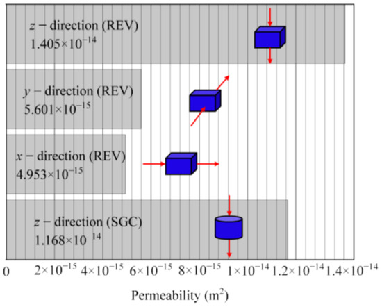 Permeability of REV and SGC specimens. The x, y, and z directions respectively indicated by the red arrows in the figure.