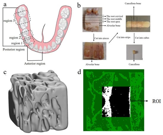 CBAB samples. (a) Schematic diagram of the tooth region. (b) Sample preparation process (c) CBAB reconstruction image under micro-CT. (d) Selected region of interest (ROI).