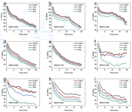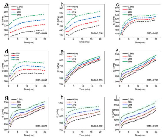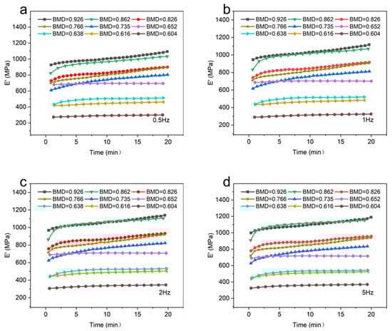 It can be seen that at the same temperature and frequency, the BMD of CBAB increased from 0.604 g/cm3 to 0.926 g/cm3 and the storage modulus also increased gradually in general. For samples with lower BMD (BMD = 0.652, BMD = 0.638, BMD = 0.616, BMD = 0.604), the storage modulus demonstrated a relatively gradual and linear change over time. At intermediate BMD levels (BMD = 0.826, BMD = 0.766, BMD = 0.735), the storage modulus exhibited an upward trend, as evidenced by an increasing slope in the curve. In the case of CBAB samples with higher BMD (BMD = 0.926, BMD = 0.862), it was evident that the storage modulus initially underwent a rapid increase, followed by a steady rise. With the increase in frequency, the duration of the rising stage was longer. From 1 Hz to 5 Hz, the average storage modulus of CBAB samples with lower BMD increased by 12%, and the storage modulus of CBAB samples with higher BMD increased by 23%.