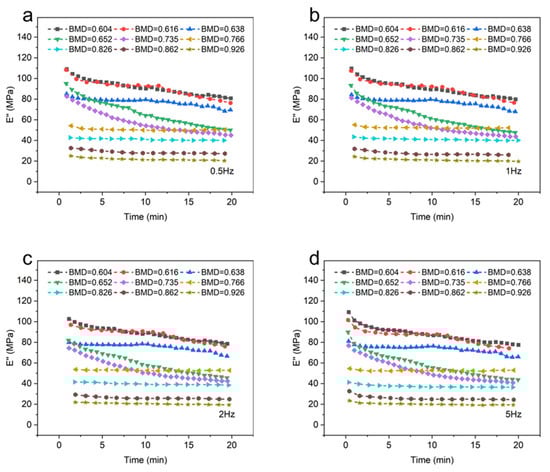 Figure 4 depicts the loss modulus (E″) of different BMD samples. When the temperature and frequency were consistent, a negative correlation was observed between the BMD and the loss modulus of CBAB.
