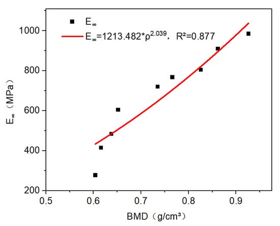 For CBAB, its viscoelastic modulus was greatly affected by BMD. The equilibrium modulus () for all CBAB ranged from 260 to 985, which varied with BMD (). It can be described by an exponential function, such as (r2 = 0.877). With the increase in BMD, the equilibrium modulus increased, as shown in Figure 7. This relationship was consistent with the modulus–BMD relationship of bone previously reported in the literature [23].
