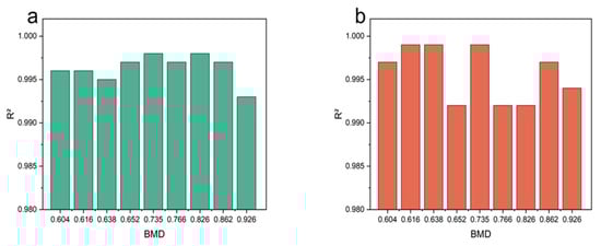 The determination coefficient R2 was used to evaluate the accuracy of the fitting. R2 varies between 0 and 1, so the closer the R2 value is to 1, the better the fitting is. The sample fitting curves of different BMD are shown in Figure 8, and it can be seen that the fitting was satisfactory (R2 > 0.991).