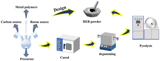 The general flow chart for synthesizing high-entropy boride (HEB) powder is shown in Figure 1. In this work, metal alkoxides (MA, M = Ti, Zr, Hf, Nb, Ta, Mo, W) were used as the initial metal sources. TiA (titanium n-propoxide, Ti(OC3H7)4, purity > 99 wt%, in n-propanol) and ZrA (zirconium n-propoxide, Zr(OC3H7)4, purity > 72 wt%, in n-propanol) were purchased from Heruidong Co., Ltd., Shandong, China. HfA, NbA, WA, MoA, and TaA were prepared by the corresponding metal chloride; for instance, TaA was synthesized by the reaction of TaCl5 and n-propanol, using triethylamine (Et3N) as a precipitant with a TaCl5/ n-propanol /Et3N molar ratio of 1/5/5 and glycol dimethyl ether as a solvent. The precipitate was removed by filtration to obtain a clear solution. Acetylacetone (Hacac) was added to MAs at room temperature with a mole ratio of MA:Hacac = 1:1 to obtain stable solutions of metal acetylacetonate alkoxides (MAAs). Afterwards, controlled co-hydrolysis and polycondensation reactions were achieved by the dropwise addition of deionized water with a molar ratio of MAAs: H2O = 1:1, followed by distillation to obtain metal polymers. Borate ester (BE, self-made in our laboratory) and allyl-functional novolac (AN) resin (self-made in our laboratory) acted as sources of boron and carbon, which were respectively dissolved in normal propyl alcohol and added to the solution of metal polymers. The proportion of the molarities of the metal source, the molarities of the boron source, and the mass of the carbon source (M: B: C) were studied to obtain high-purity, high-entropy borides. The mixture was continually stirred at 25 °C for 2 h to obtain a homogenous solution. The solvent was partially removed to obtain the HEB precursor by rotary evaporation. Subsequently, precursors were heated at 100 °C, 140 °C, 180 °C, 200 °C, 220 °C, and 250 °C each for an hour. The obtained powders were heated in an alumina tube furnace to remove substances released at 400 °C for 2 h in an argon atmosphere. Afterwards, the above samples were pyrolyzed to undergo a boro/carbothermal reduction reaction with a heating rate of 10 °C/min at 600 °C, 800 °C, 1000 °C, 1200 °C, 1400 °C, 1600 °C, and 1800 °C for 4 h to obtain ceramic powders in a graphite furnace.