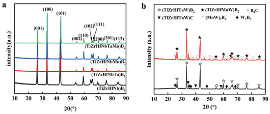 XRD patterns of the as-synthesized powders: (a) (Ti, Zr, Hf, Nb)B2, (Ti, Zr, Hf, Nb, Ta)B2, (Ti, Zr, Hf, Nb, Mo)B2, and (Ti, Zr, Hf, Nb, Ta, Mo)B2. (b) (Ti, Zr, Hf, Ta, W)B2 and (Ti, Zr, Hf, Mo, W)B2.