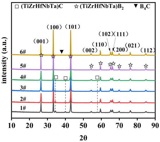 XRD patterns of the different proportions of (Ti, Zr, Hf, Nb, Ta)B2 powders. 1#–6# represent ceramic powders pyrolyzed at 1800 with different contents of boron and carbon sources, and these specific proportions can be found in Table 2.