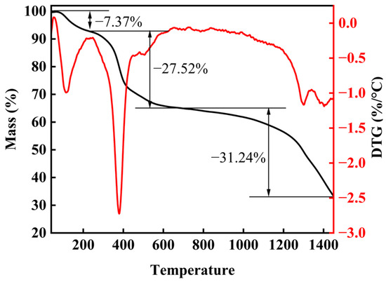 To gain a deeper insight into the pyrolysis process of high-entropy boride (HEB) precursors, we conducted a study on the pyrolysis process of the cured products using thermogravimetric analysis (TG). As depicted in Figure 4, the TG-DTG curves reveal a pyrolysis process comprising three distinct phases. The first part, extending from room temperature to 237 °C, is associated with a weight loss of approximately 7.37 wt%. This initial weight loss is primarily attributed to the removal of hydroxyl groups present in the sample and a small amount of adsorbed water vapor. The second part occurs within the temperature range of 237 °C to 680 °C and results in a weight loss of about 27.52 wt%. This phase signifies the transformation from organic to inorganic materials, involving the breakdown of organic-inorganic molecular chains and the substantial departure of organic groups. The final phase is linked to the boron-carbon thermal reduction process, potentially leading to the release of CO, CO2, and B2O3 [26]. This phase is marked by a substantial weight reduction of 31.24 wt%. During this stage, metals gradually form borides, laying the groundwork for the ultimate formation of a single-phase high-entropy boride. These discoveries hold significant importance for comprehending and refining the preparation process for high-entropy borides.