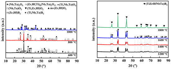 We conducted further research into the transformation of the (Ti, Zr, Hf, Nb, Ta)B2 precursor from a polymer to ceramics using X-ray diffraction (XRD). Figure 5 illustrates the results of this investigation, showing the evolution of phases at different heat treatment temperatures. Samples treated at 600 °C are predominantly composed of oxide phases, including (Nb, Ta)2O5, (Zr, Hf, Ti)6(Nb, Ta)2O17, (Ti, Zr, Hf)O2, and (Nb, Ta)O2. As the annealing temperature increases to 800 °C, (Nb, Ta)2O5 and (Ti, Zr, Hf)O2 gradually transform into (Ti, Nb, Ta)O4. When the temperature is further raised to 1000 °C, oxide phases such as m-(Zr, Hf)O2 undergo a reaction with B and C elements, resulting in a two-phase structure primarily consisting of (Zr, Hf)B2 and (Ti, Nb, Ta)B2. It is noteworthy that the diffraction peaks of (Zr, Hf)B2 are observed to the left of the diffraction peaks of (Ti, Nb, Ta)B2 due to the larger atomic radii of Zr and Hf. Simultaneously, the diffraction peak intensity of (Zr, Hf)B2 is lower than that of (Ti, Nb, Ta)B2, indicating a relatively lower content of (Zr, Hf)B2 due to the continued presence of some Zr and Hf elements in oxide form. As the heat treatment progresses from 1200 °C to 1600 °C, the powder maintains a two-phase structure, and the diffraction peaks intensity of (Zr, Hf)B2 gradually approaches that of (Ti, Nb, Ta)B2. This suggests the nearly complete transformation of metal oxides into borides. Figure 4 shows that there is still a mass loss after 1200 °C, primarily due to TG being conducted in an Ar atmosphere, which slows down the volatilization of excess boron oxide. The pyrolysis process, carried out in a vacuum, has almost entirely volatilized the boron oxide by 1200 °C. Ultimately, through element diffusion, (Zr, Hf)B2 and (Ti, Nb, Ta)B2 form a single-phase solid solution, (Ti, Zr, Hf, Nb, Ta)B2, in the heated samples at 1800 °C.