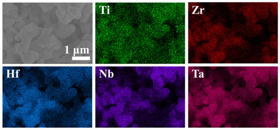 As depicted in Figure 6, we conducted a scanning electron microscopy (SEM) study to examine the morphology of (Ti, Zr, Hf, Nb, Ta)B2 ceramics obtained at different temperatures ranging from 600 °C to 1800 °C. The morphological changes in the powders between 600 °C and 800 °C are relatively minor, primarily consisting of particles and a filament network. According to XRD results, the particles mainly consist of metallic oxides enveloped within an amorphous layer formed by the interaction of carbon and boron. The formation of filament materials is likely due to a high-temperature softening process followed by cooling and drawing, presumed to be caused by an excess of boron esters. At 1000 °C, the filament materials disappear, suggesting substantial decomposition of the boron esters at this stage. A small number of crystalline particles are enveloped within a mixture of amorphous boron oxide and carbon. According to XRD results, these particles are composed of oxides and a small amount of borides. The amorphous materials cannot be observed around the powders obtained at 1200 °C to 1400 °C. However, there are two types of particles in these powders, with the larger particles likely being the first-formed boride crystals. The powders at 1800 °C exhibit significantly increased particle size compared to those at 1600 °C, accompanied by some degree of sintering. Figure 7 demonstrates the image of SEM and particle size distributions of (Ti, Zr, Hf, Nb)B2, (Ti, Zr, Hf, Nb, Ta)B2, (Ti, Zr, Hf, Nb, Mo)B2, and (Ti, Zr, Hf, Nb, Ta, Mo)B2, which show that the ceramic samples prepared by the liquid precursor method have a particle size of approximately 340–570 nm. Figure 8 is the SEM and EDS image of the (Ti, Zr, Hf, Nb, Ta)B2 heat treat at 1800 °C, which revealed a uniform distribution of metallic elements at the micrometer scale with no evidence of metallic element enrichment.