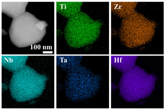TEM image and the corresponding EDS maps of (Ti, Zr, Hf, Nb, Ta)B2 powders obtained at 1800 °C.