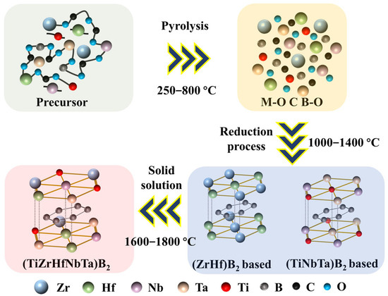 Based on the above analysis, we hypothesize the decomposition mechanism of the (Ti, Zr, Hf, Nb, Ta)B2 liquid precursor as depicted in Figure 11. During the heat treatment process below 800 °C, the liquid precursor primarily undergoes an organic-to-inorganic transformation, leading to the formation of various metal oxide solid solutions and amorphous carbon and boron oxides. When the decomposition temperature falls within the range of 1000 °C to 1400 °C, the main process involves a carbon-boron thermal reduction reaction, resulting in a two-phase structure primarily composed of (Zr, Hf)B2 and (Ti, Nb, Ta)B2. As the decomposition temperature increases from 1600 °C to 1800 °C, the process primarily entails phase solid solution, ultimately culminating in the formation of the hexagonal (Ti, Zr, Hf, Nb, Ta)B2 single-phase solid solution.