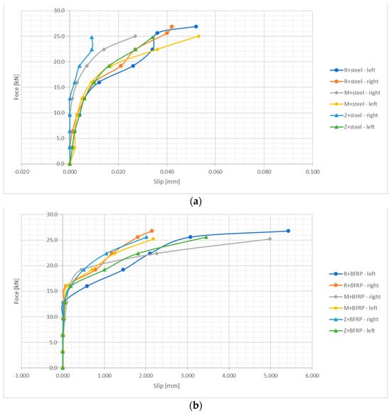 The results for the tensile stresses in the bar measured at slip show that stresses increase with increasing slippage. In the R-GFRP and M-GFRP series, in which metakaolin was added to the concrete along with glass bars, the highest increase in the values of tensile stresses was observed at all stages, i.e., from 0.01 to failure. In the R-BFRP and M-BFRP series, in which metakaolin was added to the concrete along with basalt bars, a 25% increase in tensile stress was noticed at failure. In the Z series, a remarkable increase in the applied forces at slip, i.e., up to 64%, was observed for glass bars (GFRP). On average, compared to the reference concrete, the increase was approx. 30%.